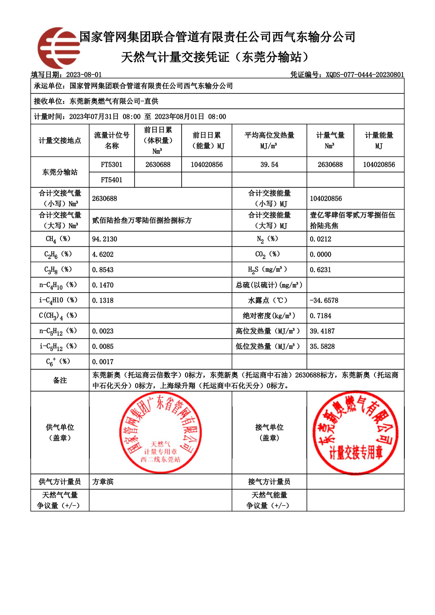 東莞新奧燃氣2023年8月份供氣質量檢查報告公示