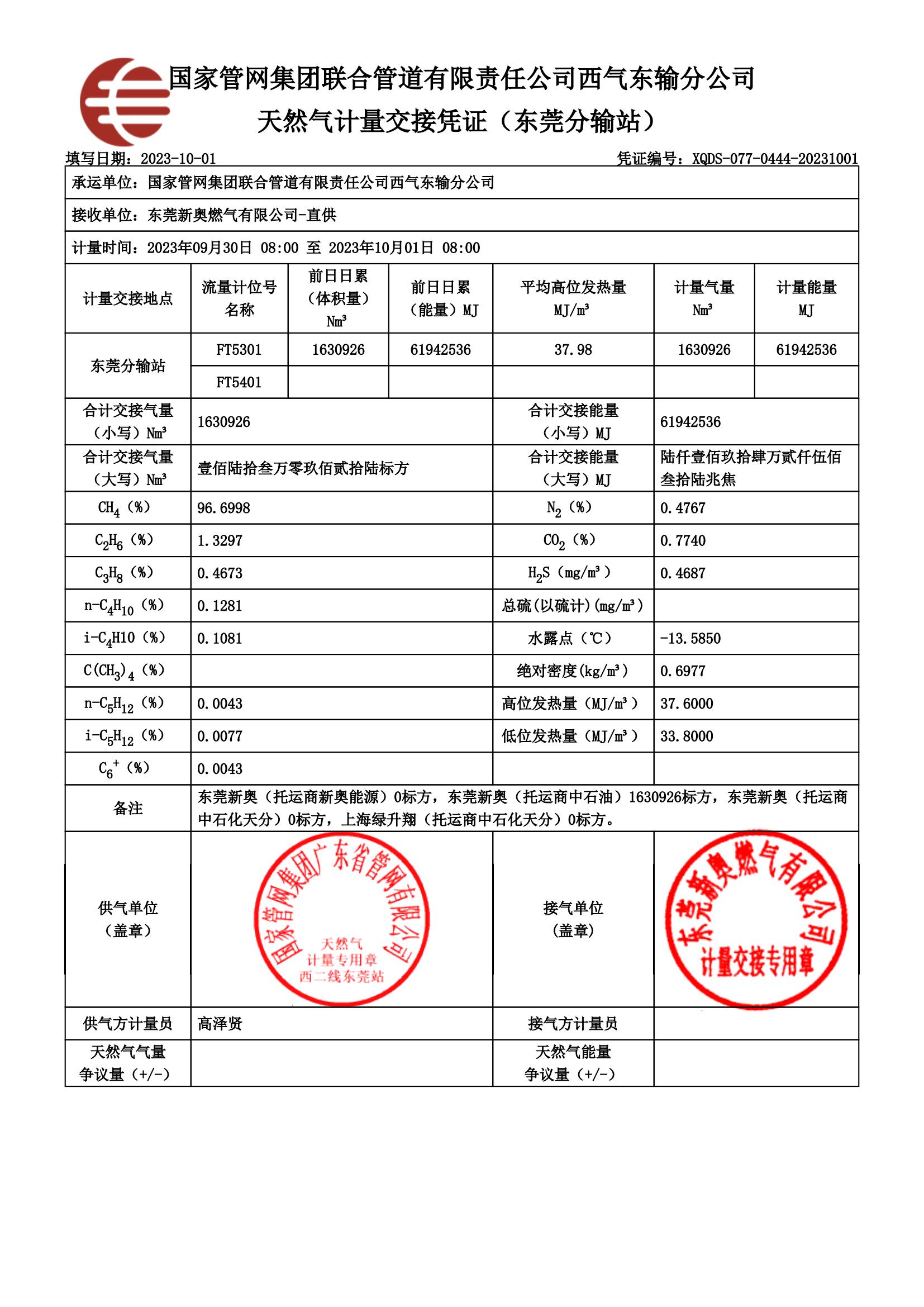 東莞新奧燃氣2023年10月份供氣質量檢查報告公示