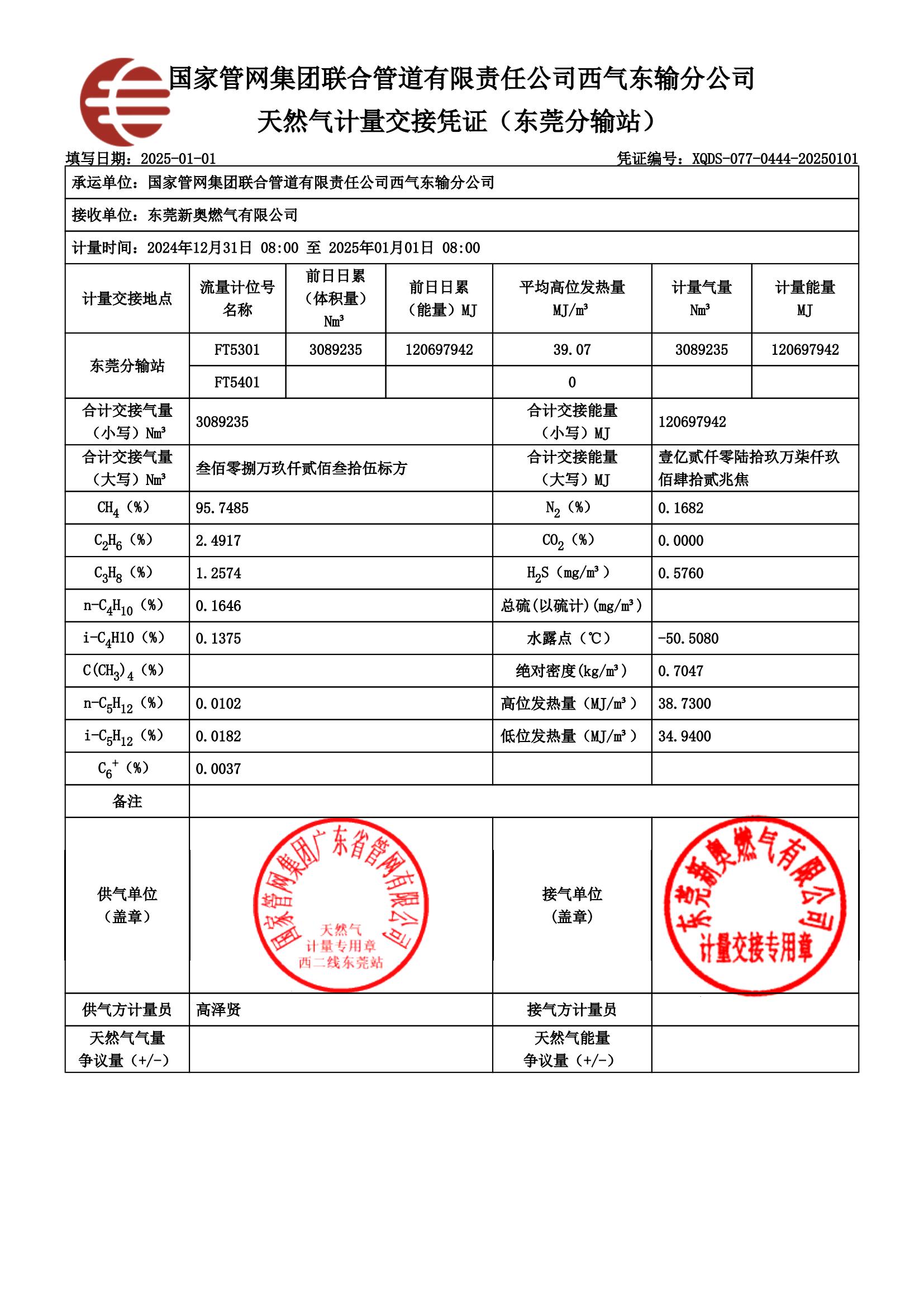 東莞新奧燃氣2025年1月份供氣質量檢查報告公示