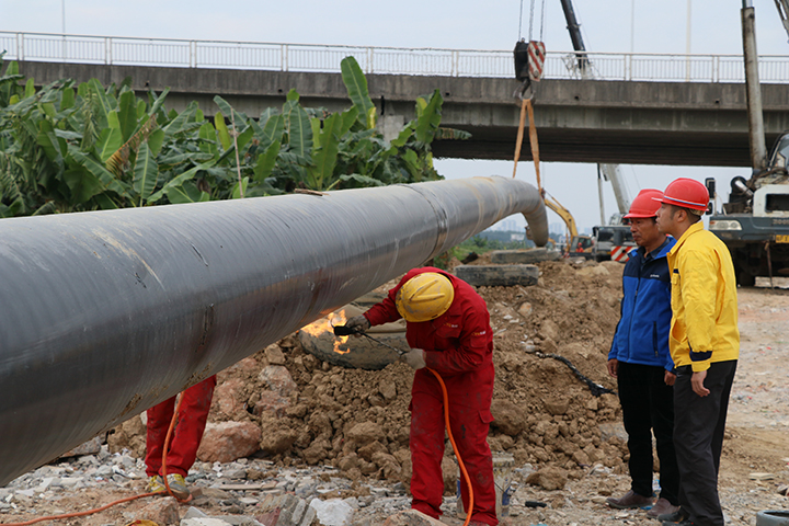 但水鄉片區地下水位高,地質松軟,給敷設工程帶來了不小的困難。“挖好的管道溝還沒來得及放下鋼管就被下沉的淤泥覆蓋了,我們只能邊挖邊用鋼板在兩側加固,管道才能順利敷設。”東莞新奧工程技術管理部相關負責人介紹,整個項目全長14公里,3次橫穿公路,5次穿越河涌。為了減少對地貌和交通的影響,工程組靈活使用定向鉆穿越、頂管及直埋敷設施工方法。