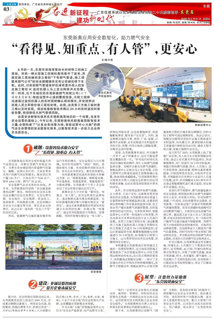8月的一天,東莞市濱海灣某處長時(shí)間停工的施工現(xiàn)場(chǎng),突然一輛大型施工挖掘機(jī)轟鳴著開了進(jìn)來,而就在施工現(xiàn)場(chǎng)赫然豎立著的“下有燃?xì)夤艿溃┕ふ?qǐng)聯(lián)系燃?xì)夤尽钡陌踩嵝雅撇]有讓挖掘機(jī)停下車輪。此時(shí),識(shí)別到燃?xì)夤艿辣Wo(hù)區(qū)域有意外闖入的安全施工管控AI監(jiān)控機(jī)器人馬上發(fā)出陣陣聲光告警。同一時(shí)間,位于東城區(qū)的東莞新奧燃?xì)庥邢薰荆ㄒ韵潞?jiǎn)稱東莞新奧)智能運(yùn)營中心接到警報(bào)信息,示險(xiǎn)工程師迅速通過監(jiān)控機(jī)器人的實(shí)時(shí)視頻確認(rèn)現(xiàn)場(chǎng)情況,并安排附近巡線人員立即前往施工現(xiàn)場(chǎng)處理。此前,這類第三方施工臨時(shí)復(fù)工難以及時(shí)發(fā)現(xiàn),現(xiàn)在依靠數(shù)智技術(shù)得以24小時(shí)實(shí)時(shí)監(jiān)控和智能告警,有效降低天然氣管損風(fēng)險(xiǎn)。